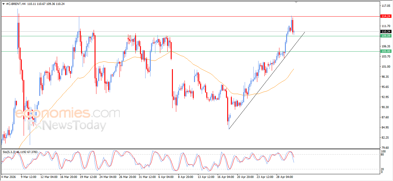 Il Brent è sceso durante le recenti contrattazioni intraday, dopo aver raggiunto il livello di resistenza di 114,00 dollari, che era l'ultimo obiettivo nella nostra precedente analisi, per consolidare i guadagni dei precedenti rialzi, tentando di scaricare parte dei livelli di ipercomprato sugli indicatori di forza relativa, soprattutto con l'emergere di segnali negativi da parte degli stessi, per recuperare la forza positiva che potrebbe aiutarlo a riprendersi e a risalire, nel contesto del predominio del trend rialzista principale nel breve termine.