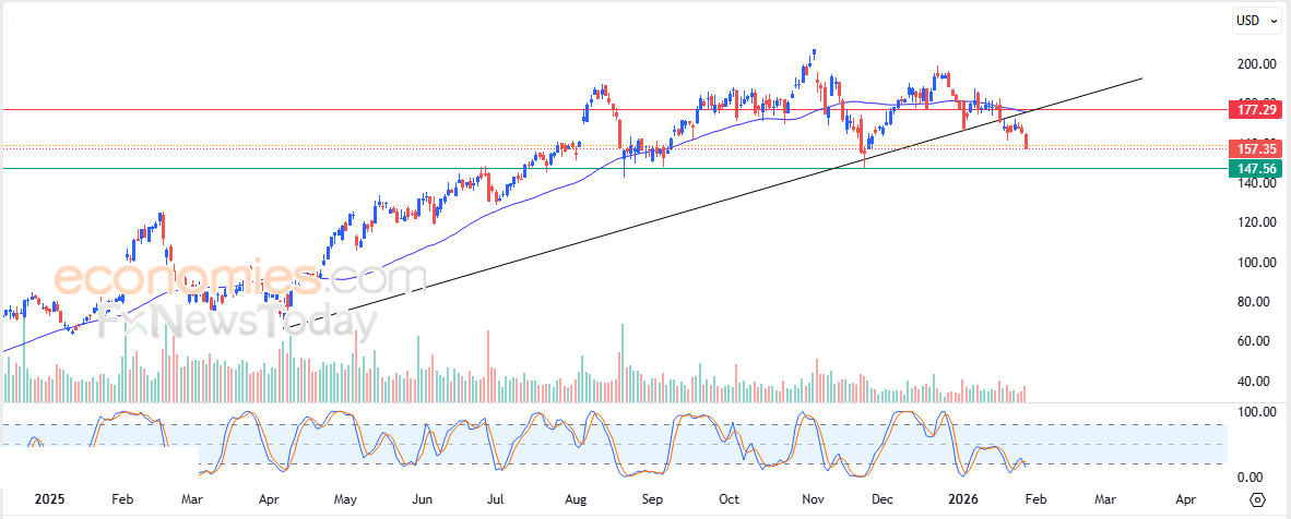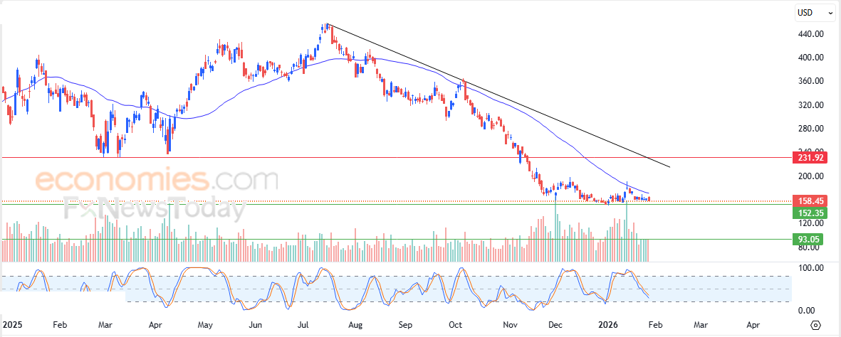 Pertanto ci aspettiamo che il prezzo delle azioni scenda nelle prossime contrattazioni, soprattutto se conferma una rottura al di sotto del livello di supporto di $ 152,35, per raggiungere il supporto successivo a $ 93,00.