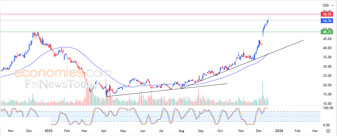 Pertanto prevediamo che il titolo continuerà a salire nelle prossime contrattazioni, puntando al vicino livello di resistenza a 58,25 $, con forti possibilità di breakout.