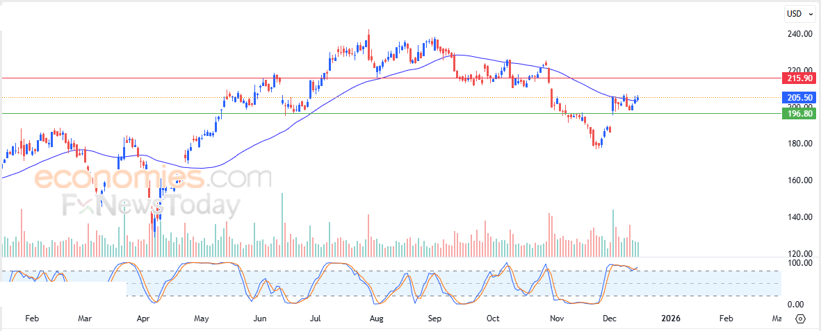 Pertanto ci aspettiamo che il titolo aumenti nelle prossime contrattazioni, soprattutto finché rimarrà al di sopra del livello di supporto a 196,80 $, puntando al livello di resistenza a 215,90 $.