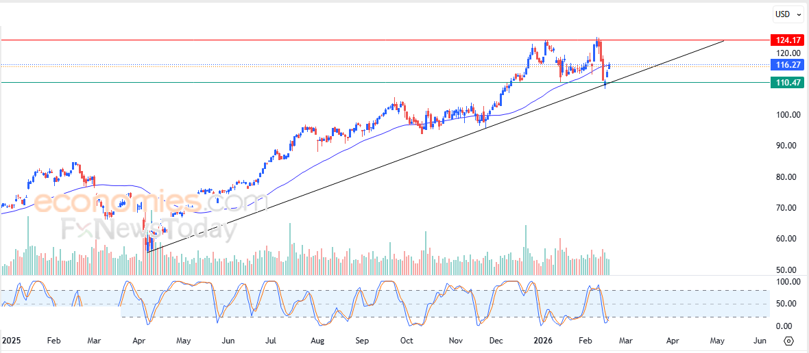Pertanto prevediamo che il prezzo delle azioni aumenterà durante le prossime sessioni di negoziazione, a patto che il supporto a 110,50 $ rimanga intatto, puntando al livello di resistenza chiave a 124,20 $.