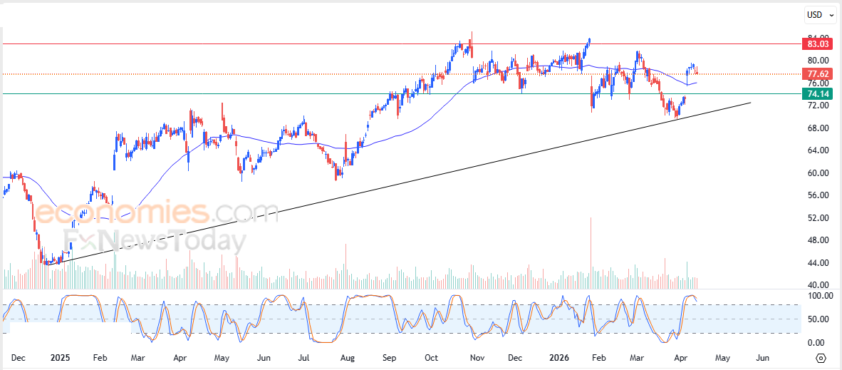Pertanto, prevediamo che il prezzo delle azioni aumenterà nelle prossime sedute di borsa, a condizione che il supporto a 74,00 rimanga intatto, puntando al livello di resistenza chiave a 83,00.