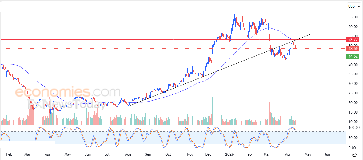 Pertanto, prevediamo un calo del prezzo delle azioni nelle prossime sedute di borsa, a condizione che la resistenza a 53,30 rimanga intatta, con un obiettivo di supporto a 44,50.
